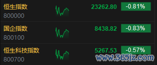 5月16日消息,港股三大指数低位震荡。截至午间收盘,恒生指数跌0.81%,报23262.80点,恒生科技指数跌0.57%,国企指数跌0.83%。盘面上,科网股涨跌不一,网易涨超13%,哔哩哔哩涨超3%,阿里巴巴跌超5%,快手、美团、京东集团跌超2%;黄金股普涨,潼关黄金涨超4%;机器人概念股多股上涨,第四范式涨超8%。
