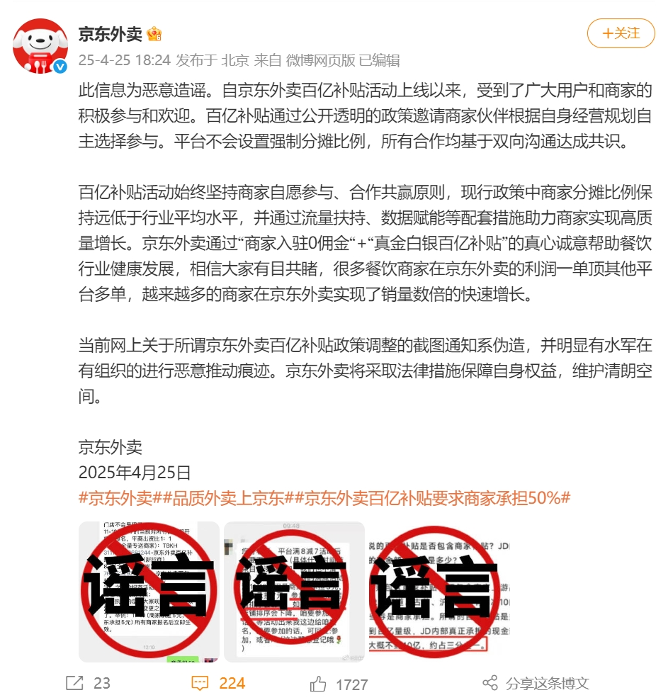 4月25日,针对部分媒体报道“京东外卖百亿补贴要求商家承担50%”一事,京东外卖发文称,此信息为恶意造谣。百亿补贴通过公开透明的政策邀请商家伙伴根据自身经营规划自主选择参与。平台不会设置强制分摊比例,所有合作均基于双向沟通达成共识。