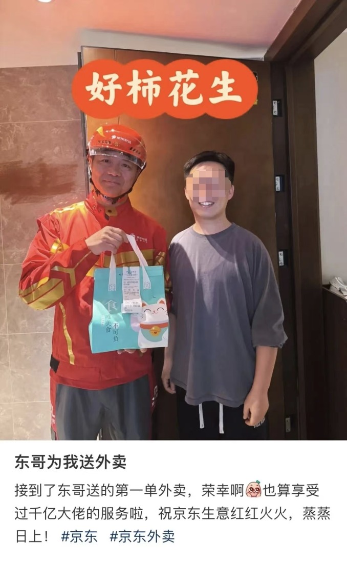 4月21日,有名为“Jeffery”的用户在社交平台发文称,“接到了东哥送的第一单外卖,荣幸啊,也算享受过千亿大佬的服务啦,祝京东生意红红火火,蒸蒸日上!”京东方面回应《每日经济新闻》记者称属实,感谢大家对京东外卖的关注与支持。