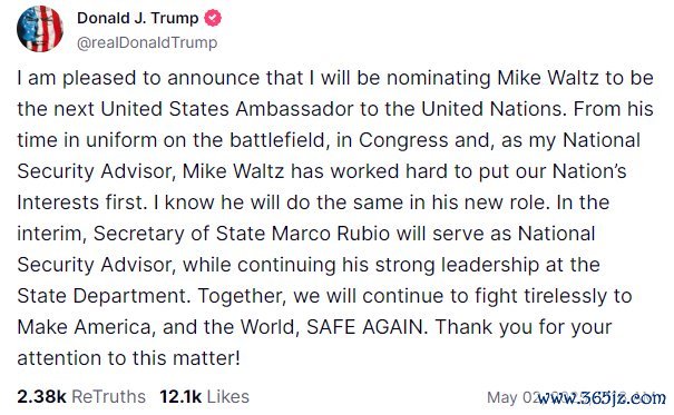 当地时间周四(5月1日),特朗普在社交媒体平台上发文称,他将提名迈克·沃尔兹为下一任美国驻联合国大使,美国国务卿鲁比奥将兼任国家安全顾问一职,同时继续在国务院发挥其作用。