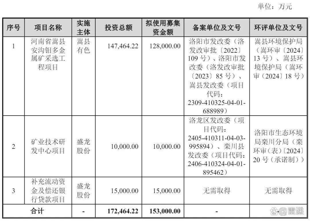 盛龙股份计划募资15.3亿元,其中,12.8亿元用于河南省嵩县安沟钼多金属矿采选工程项目,1亿元用于矿业技术研发中心项目,1.5亿元用于补充流动资金及偿还银行贷款项目。